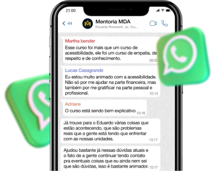 Ao participar da mentoria, você será automaticamente incluído na comunidade exclusiva de alunos no WhatsApp, onde pode interagir, compartilhar ideias e receber suporte contínuo de colegas e especialistas.